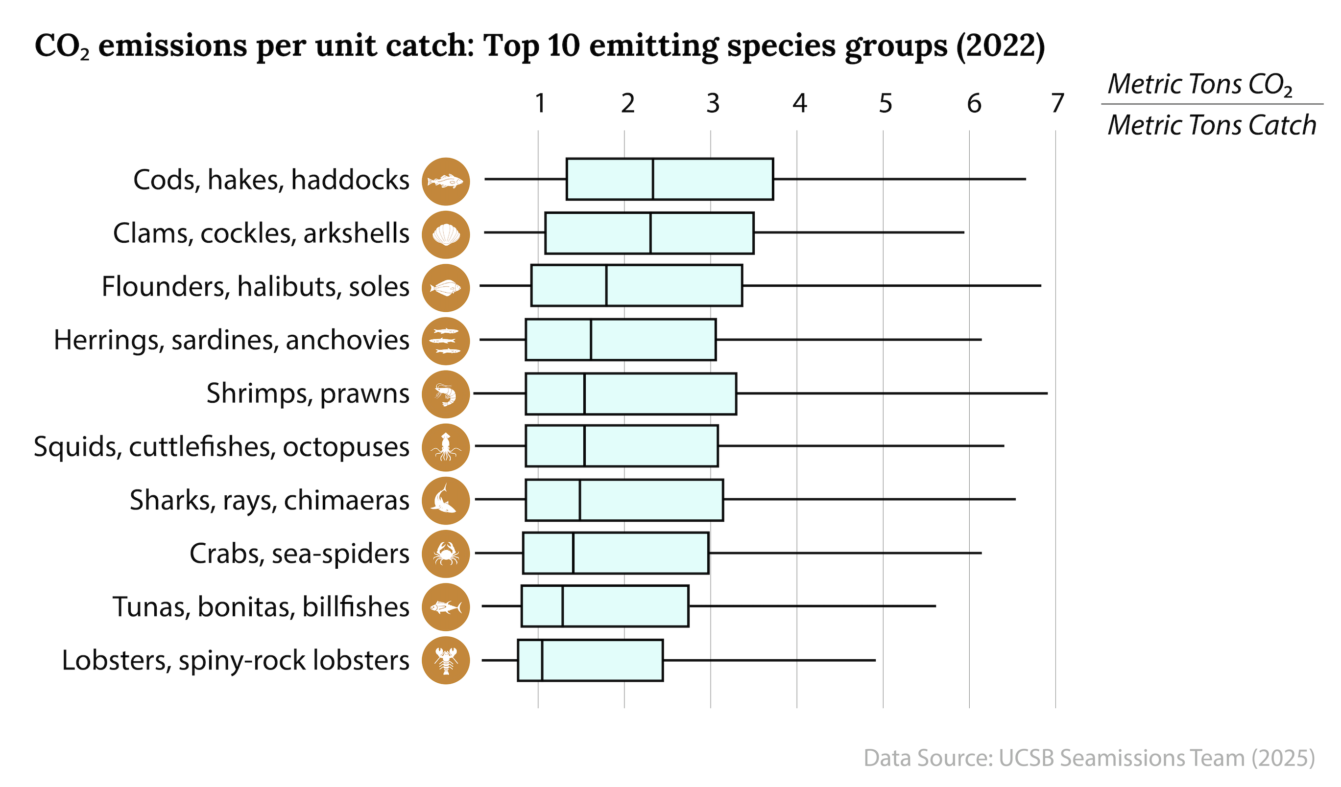 This box-and-whisker plot shows the distribution of emissions efficiency across all countries reporting catch for each species group. Boxes represent the middle 50% of values, while whiskers indicate the full range. The figure is filtered to the ten species groups with the highest total annual emissions and ordered by their emissions efficiency (the ratio of total CO₂ emissions to total reported catch weight).